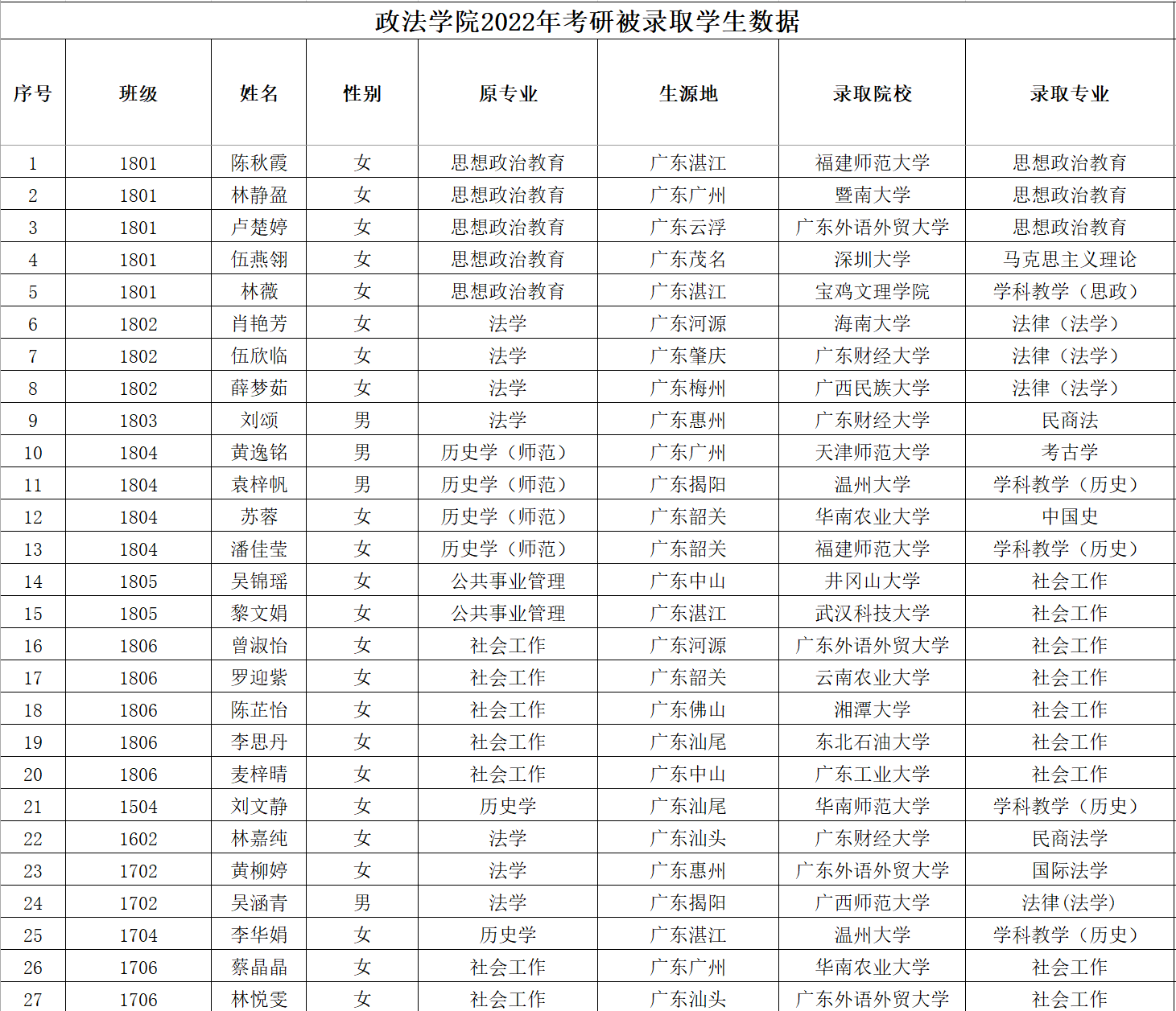 自2004年有本科毕业生以来,迄今已有280多名毕业生先后考取了北京大学、中国人民大学、中山大学、北京师范大学、东北师范大学、华南理工大学、暨南大学、华南师范大学、广东外语外贸大学、广东财经大学、南昌大学、广西师范大学、福建师范大学、深圳大学、广州大学、西南石油大学等院校的硕士研究生。