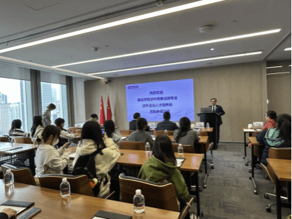 随后,见习师生一行抵达位于广州地标——周大福金融中心的北京大成(广州)律师事务所。该律师事务所主任马章凯律师、行政总监胡雅楠、大成广州办公室董事局董事张祥发律师等热情迎接见习师生,并引导大家参观了律师事务所的办公环境。在随后的交流会上,大成(广州)所马章凯主任对见习师生致欢迎辞、行政总监胡雅楠介绍了北京大成(广州)律师事务所的组织架构和运作模式、张祥发律师则介绍了律师在承办涉外商事项目的成功经验。在致欢迎辞时,马章凯主任详细介绍了大成广州事务所在全球法律服务网络中的地位、涉外法律服务业务特色以及近年来在重大涉外案件中的成功案例。他强调,随着全球化的加速推进,涉外法律服务已成为律师事务所业务的重要组成部分,而具备扎实法学基础、精通外语、熟悉国际法律规则的高素质涉外法治人才则是这一领域的中坚力量。作为一家致力于全球高端法律服务的全国知名大所,北京大成(广州)事务所非常愿意与政法学院建立紧密的合作关系,共同探索涉外法治人才的培养路径。张祥发律师则结合自身的成长经历介绍了涉外案件对律师的素质要求和现实挑战,并对同学们如何成长为一名涉外法治人才提出了学习建议。蔡国芹院长对北京大成(广州)事务所的热情接待和合作建议表示衷心的感谢,并指出政法学院一直致力于培养具有国际视野、通晓国际规则的高素质涉外法治人才。他希望双方能够进一步加强交流与合作,共同推动涉外法治人才的培养与发展。
