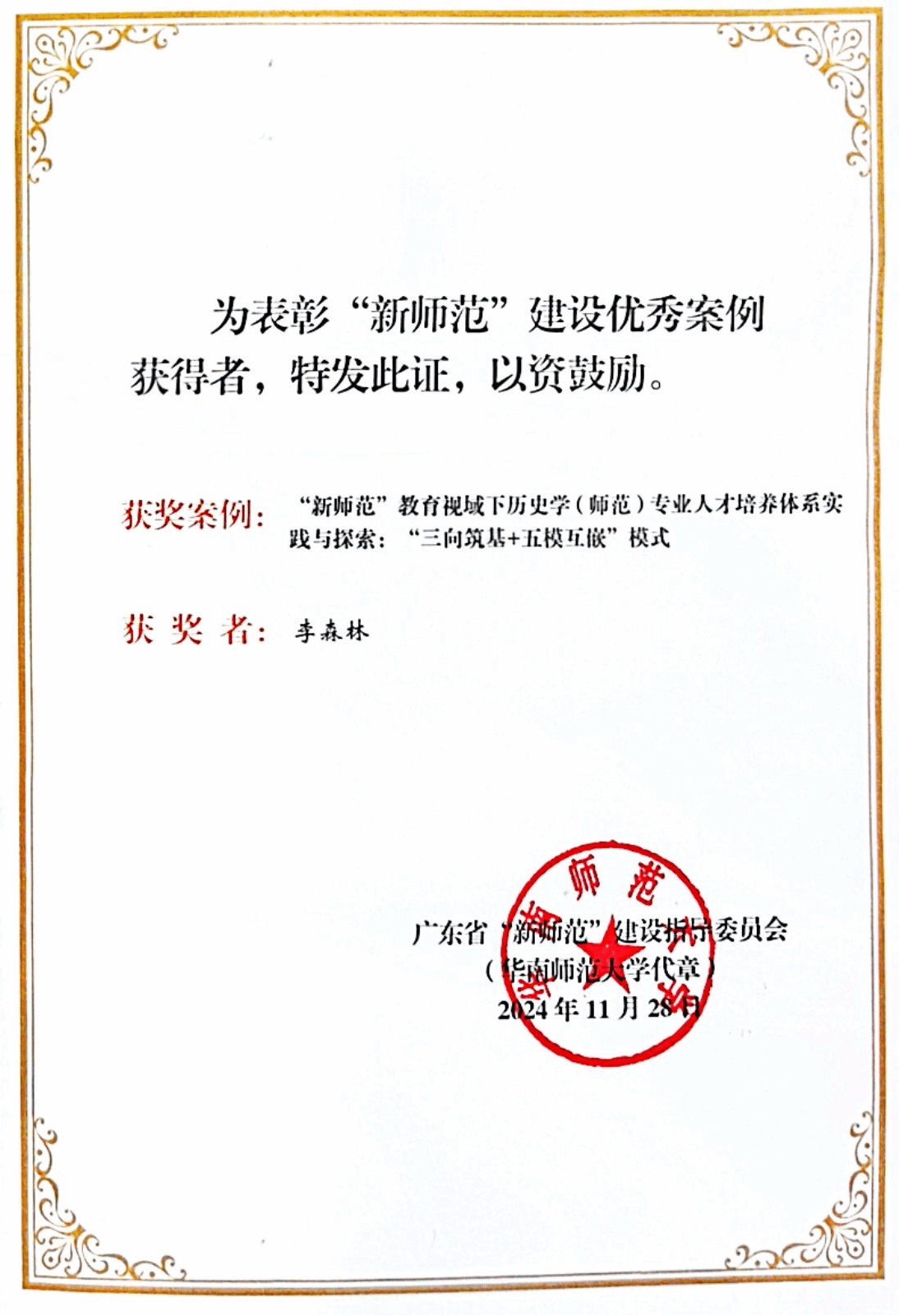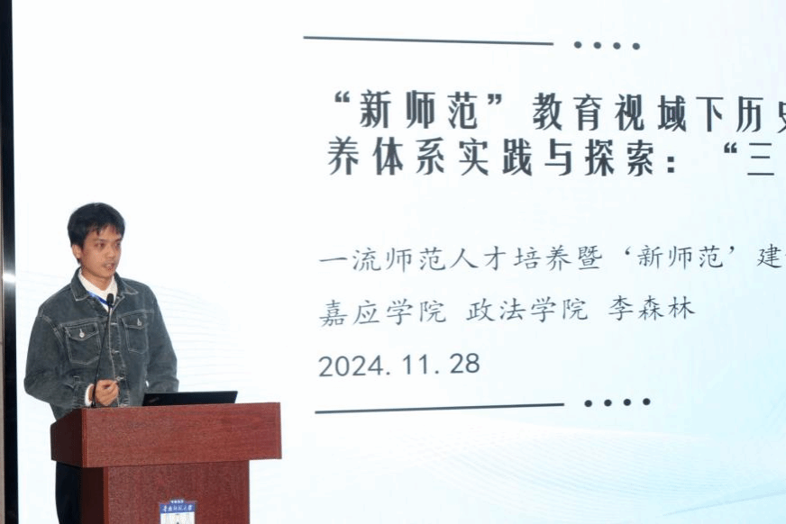 近日,广东省“新师范”建设指导委员会在华南师范大学召开一流师范人才培养暨“新师范”建设成果交流会。我院历史学专业教师李森林博士撰写的案例《新师范”教育视域下历史学(师范)专业人才培养体系实践与探索:“三向筑基+五模互嵌”模式》获评广东省“新师范”建设优秀案例。会上,李森林博士向与会人员介绍了学校历史学专业“三向筑基+五模互嵌”的人才培养体系探索与实践。