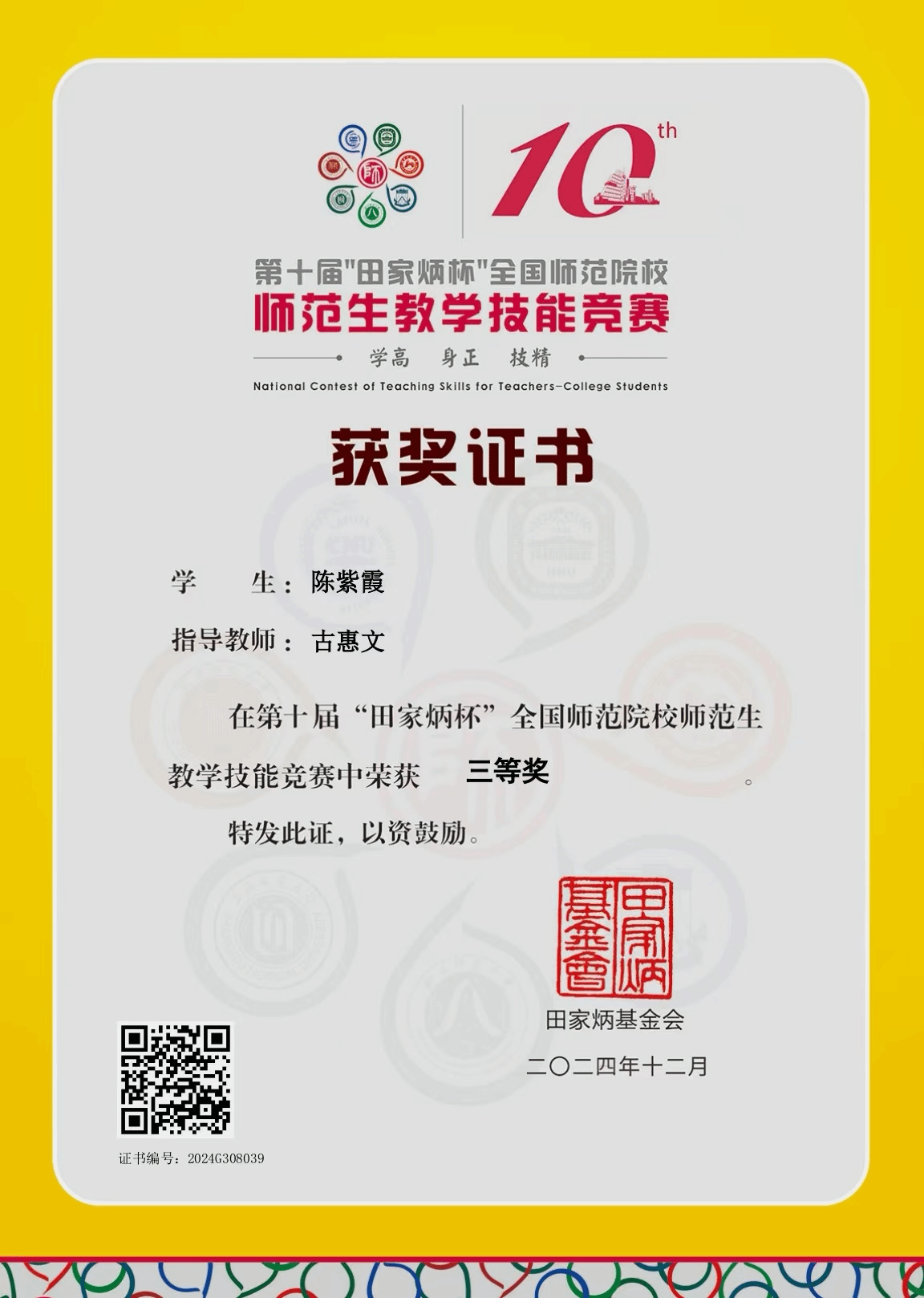 近日,我院历史学师范专业2104班学生陈紫霞同学作为“高中学段历史学专业类别”选手,参加了由浙江师范大学主办的第十届“田家炳杯”全国师范院校师范生教学技能竞赛,荣获三等奖。