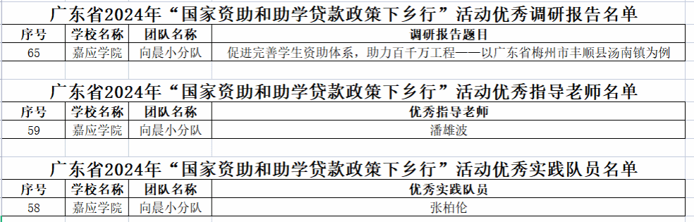 近日,广东省教育厅公布了2024年“国家资助和助学贷款政策下乡行”活动获奖名单,我院“向晨小分队”撰写的调研报告《促进完善学生资助体系,助力百千万工程——以广东省梅州市丰顺县汤南镇为例》荣获“优秀调研报告”、潘雄波老师荣获“优秀指导老师”称号、历史学专业2208班张柏伦同学荣获“优秀实践队员”称号。