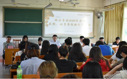 为表彰2022届考研拟录取同学,同时做好2023届考研动员,营造良好的考研氛围和学习环境,政法学院于5月18日下午在田家炳师范大楼503室召开了本年度考研表彰、动员暨经验分享大会。学院领导班子、系主任、各班班主任、辅导员、2022届考研拟录取同学、2023届考研备考同学等共80余人参与此次会议。会议由廖劲敏副院长主持。