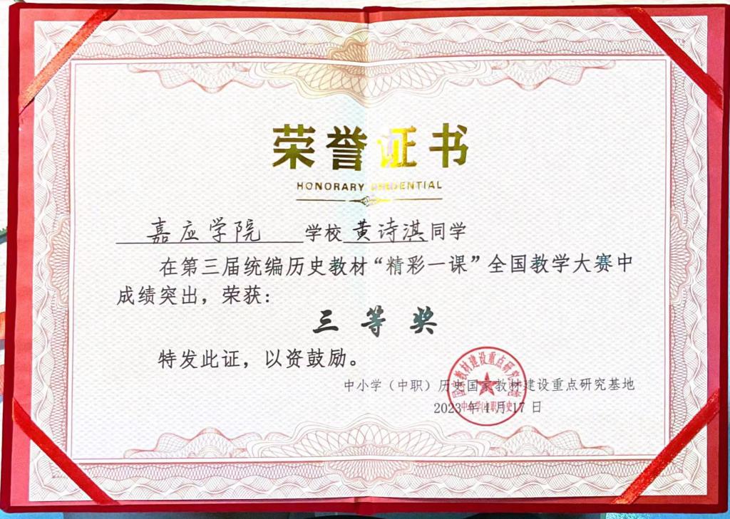 4月15日至17日,第三届统编历史教材“精彩一课”全国教学大赛暨历史教材研究高端论坛在福建师范大学举行。我院学子在第三届统编历史教材“精彩一课”全国教学大赛中成绩突出,荣获三等奖。