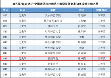 2023年12月15日,来自全国226所学校1611名选手参加第九届“田家炳杯”全国师范院校师范生教学技能竞赛初赛,我院学子2021级同学廖卓熙作为“高中学段历史学专业类别”选手在教学设计、课件制作、教学微课、说课各环节发挥出色,最终获得赛事三等奖的好成绩。