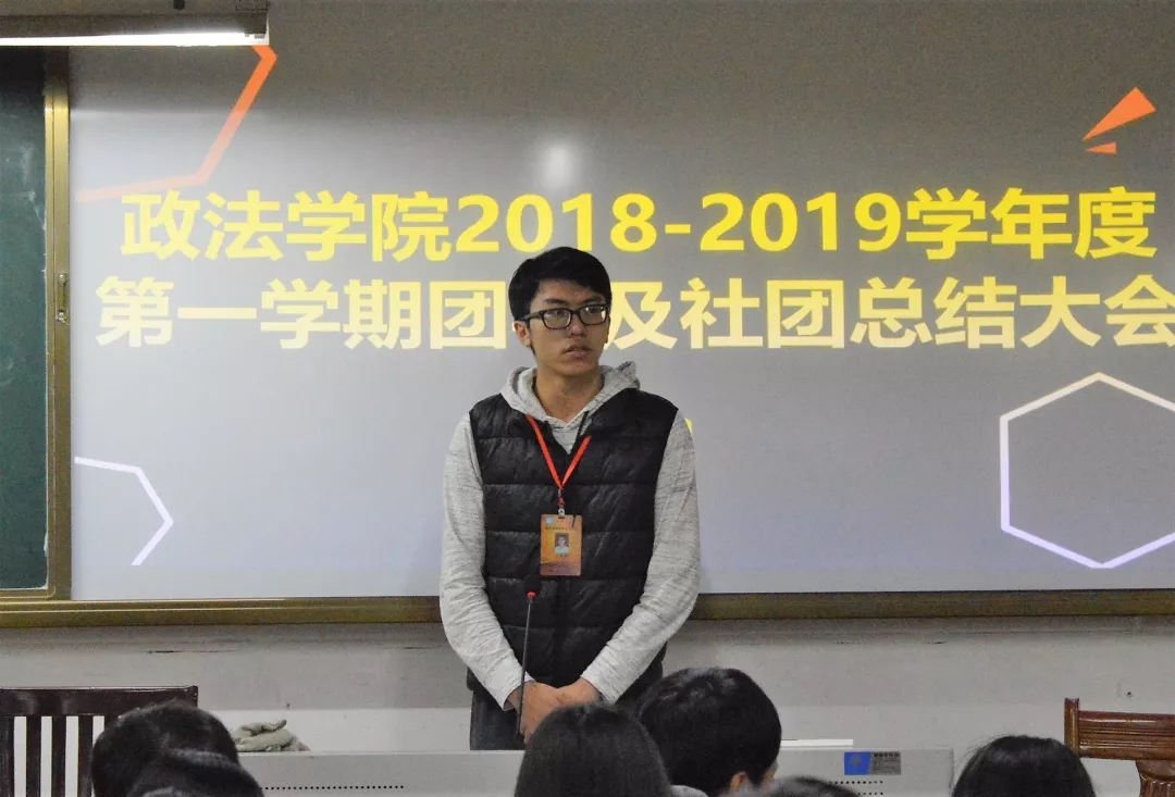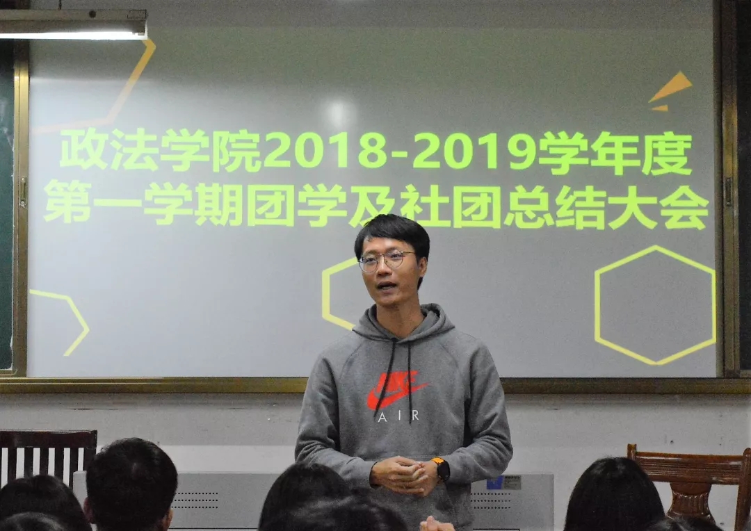 12月27日晚上,政法学院在田家炳师范教学楼504召开了2018年团学及社团工作总结大会。出席本次会议的有政法学院团总支负责人罗君源老师,团学各部门干部及各社团干部。