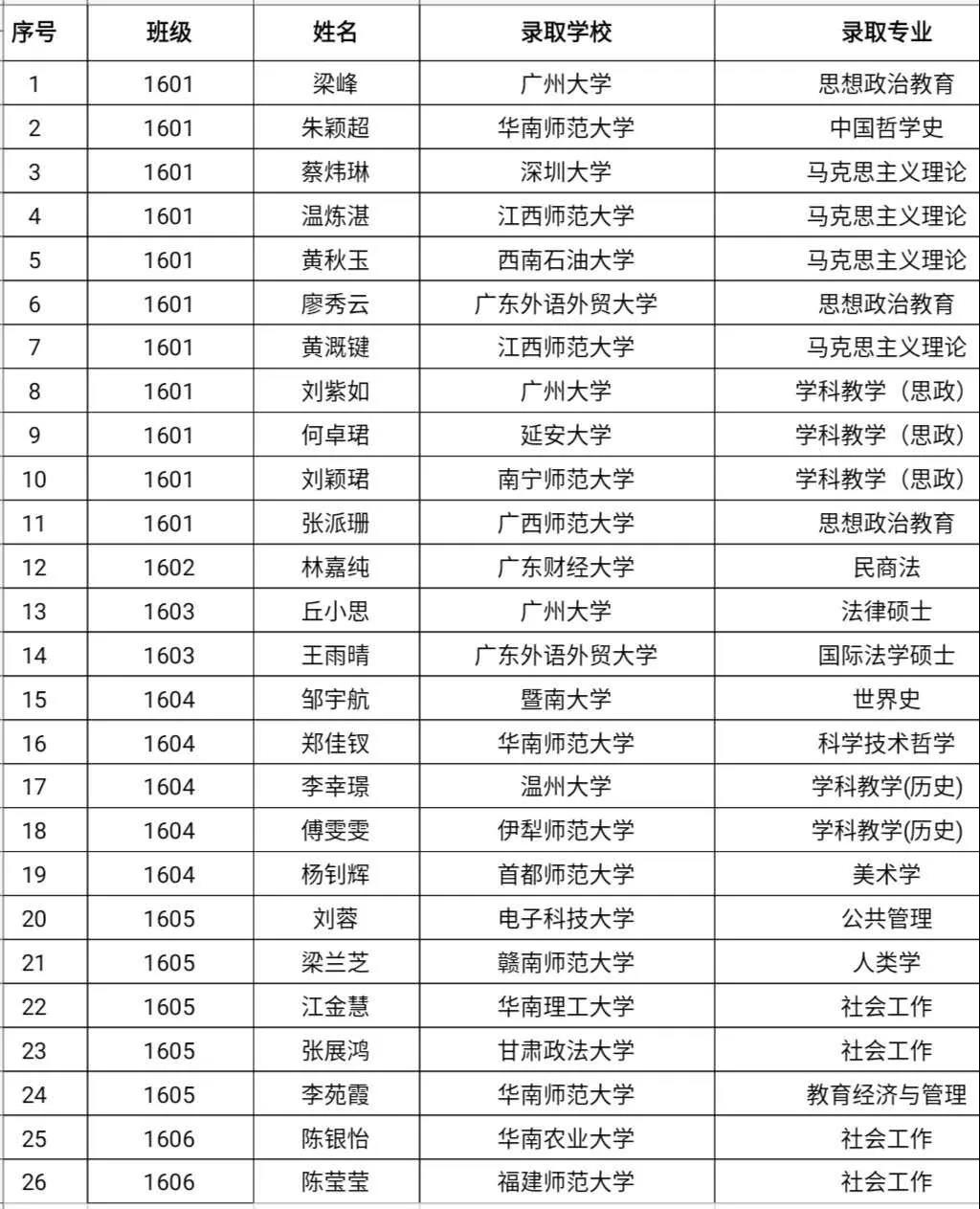 我院学子秉承“厚德敏行 博学创新”的院训精神,在学习上认真刻苦,不断提升自身的理论水平和实践技能,在全国、全省高校师范生教学技能大赛、互联网+大学生创新创业大赛、挑战杯等比赛中多次取得佳绩;法学专业学生通过法律职业资格考试(之前为司法考试)的比例连续多年超过40%。在考研方面,迄今已有180多名毕业生先后考取了北京大学、中国人民大学、中山大学、北京师范大学、暨南大学、华南师范大学、广东外语外贸大学院校的硕士研究生。