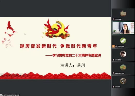 为激励共青团员认真学习贯彻党的二十大精神,营造学习宣传党的二十大精神的热潮。2022年12月10日,学院青马工程培训班开展“学习贯彻党的二十大精神”线上主题讲座。学院青马班学员70余人聆听了讲座。讲座由易珂老师主讲、钟艳群老师主持。