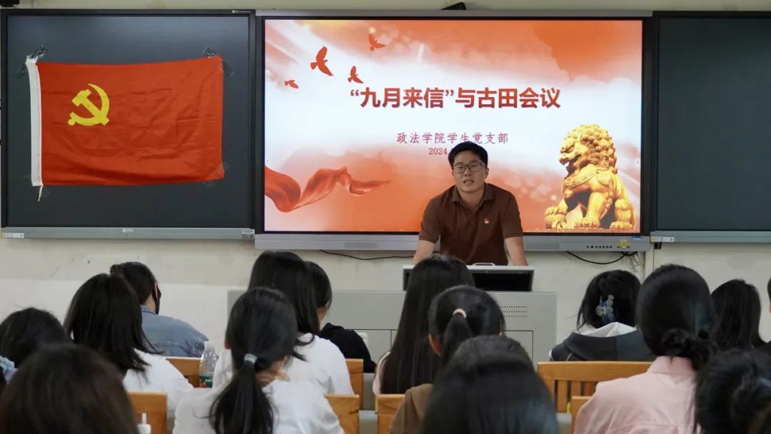为了进一步学习和贯彻党的二十大精神,深入开展党史学习教育,10月24日下午,政法学院学生党支部在田家炳师范大楼512室开展主题为《“九月来信”与古田会议》的专题党课。党课由历史系曾旭博士主讲,学生党支部书记温丽晖老师主持,全体学生党员近40人参加。
